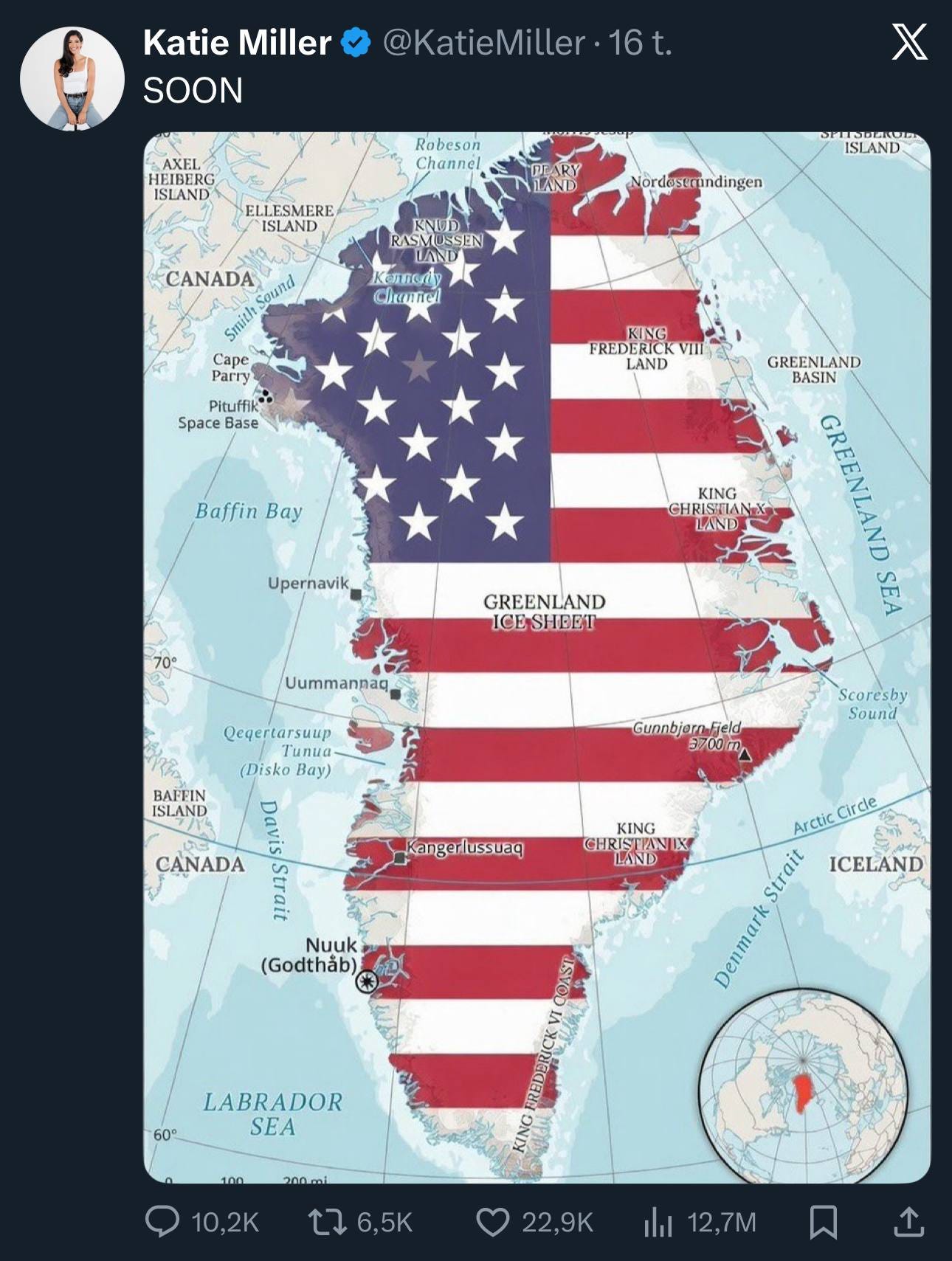 In parallel, Katie Miller, wife of Stephen Miller of the Trump regime, openly threatened Greenland in a deranged social media post. Greenland is a semi-autonomous territory of Denmark, and absolutely intends to remain so. The threat came in the form of a map of Greenland, wrapped in the American flag, with the caption of ‘Soon.’ Someone told her that this was okay to post, and that someone is likely a member of the violent Trump regime. This must not go ignored on the international stage.