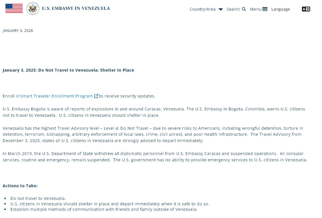 The U.S. Embassy urges all American citizens to leave Venezuela immediately. Airstrikes reportedly hit a communications facility in El Hatillo. Paramilitary units are deployed inside Caracas. A site in Carmen de Uria identified as a training camp for pro-government armed groups is struck. Reports indicate F-35 jets were involved in the operation.