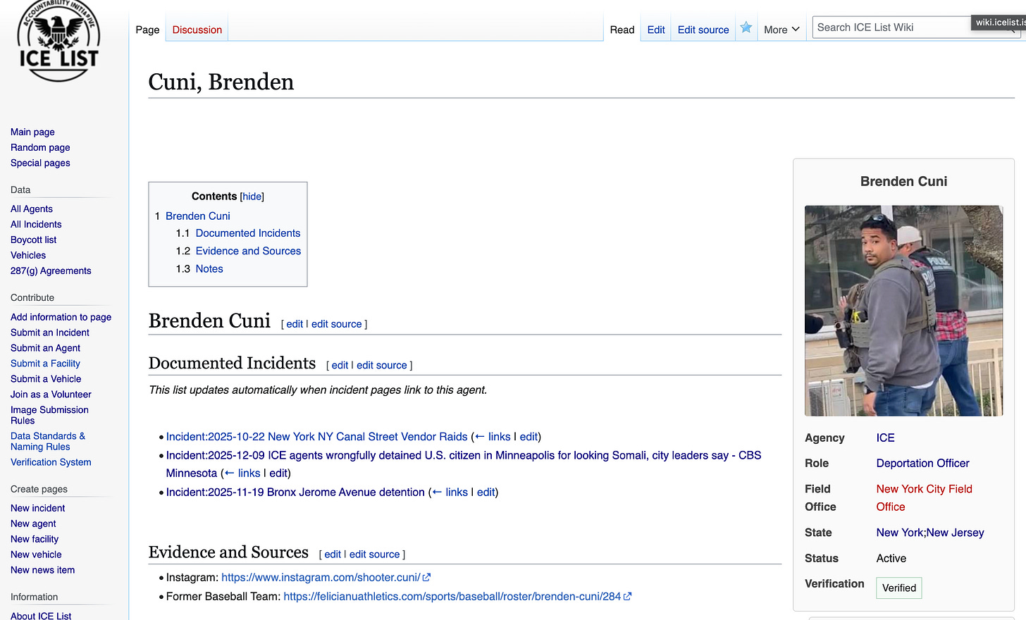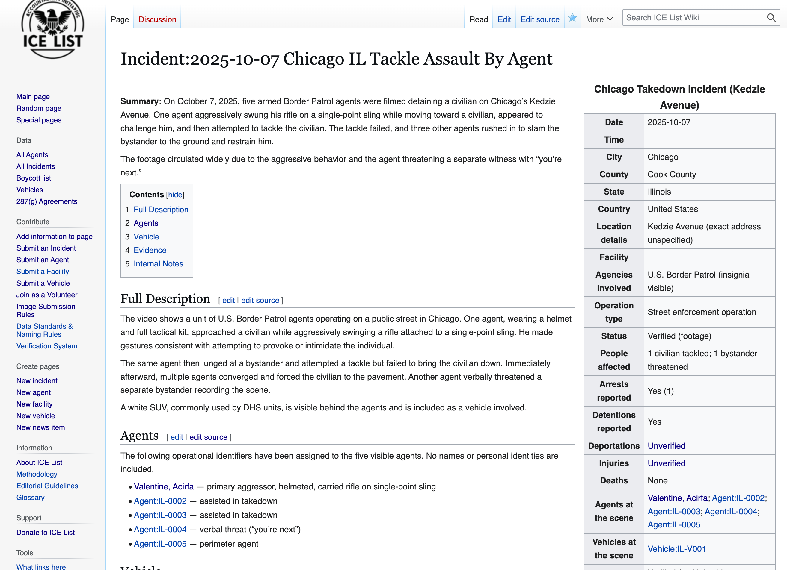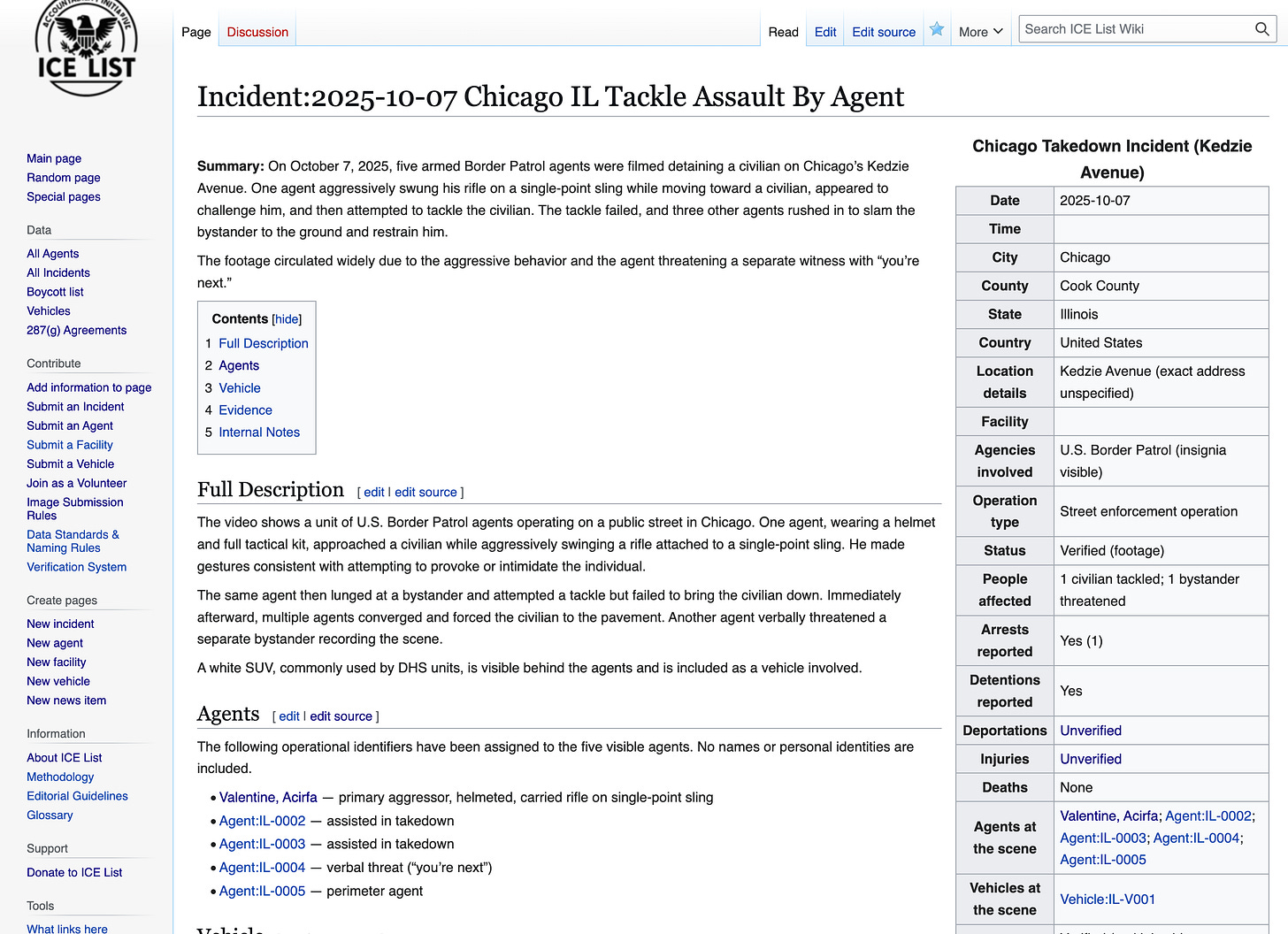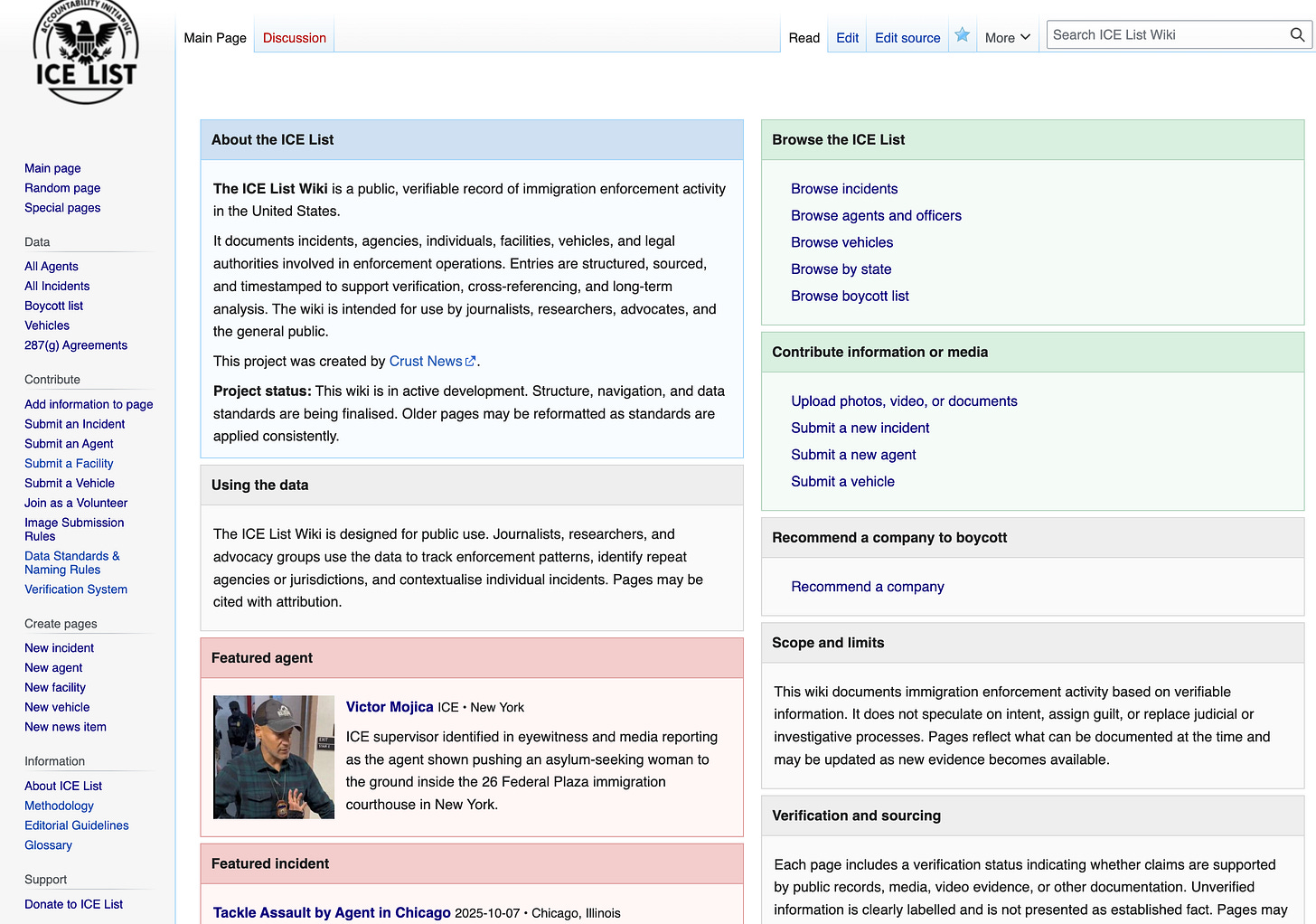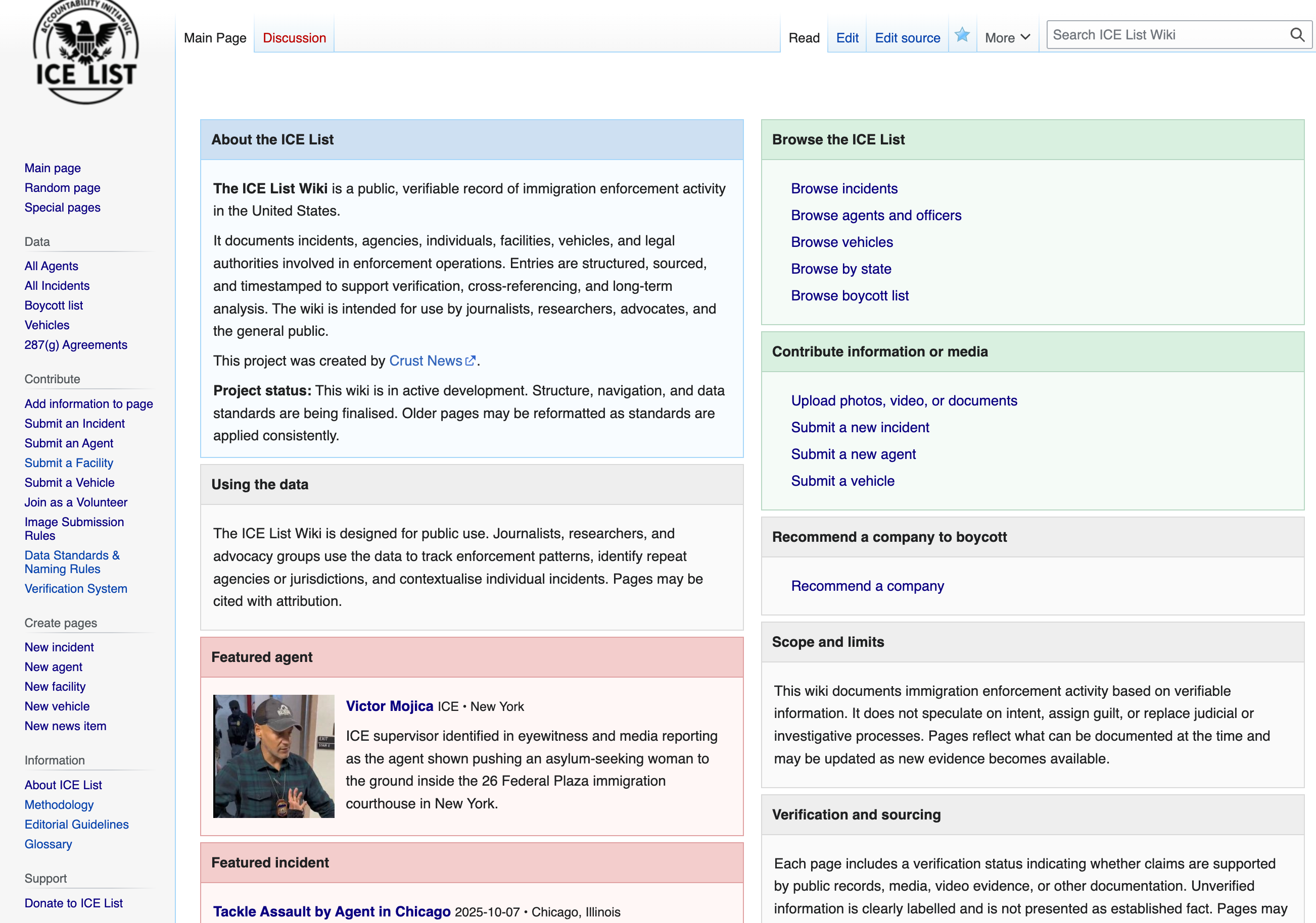 The ICE List Wiki is now public. It documents immigration enforcement activity across the United States, not just ICE, but Border Patrol, HSI, DHS more broadly, and the hundreds of local police departments operating under 287(g) agreements. Agent identities, incidents, raids, vehicles, supporting agencies, and companies propping up the regime, are recorded as the interconnected system that they are. Entries and linked to each other so that nothing exists on its own anymore. This is our Christmas gift to the USA: a record that refuses to forget.
